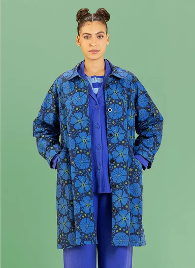 A woman with her back half-turned to the camera wearing a turquoise, patterned cardigan from Gudrun Sjödén.