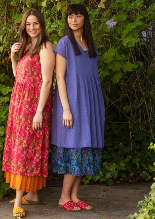 Auch ein scheinbar einfacher, einfarbiger Stoff kann durch interessante Strukturen oder ausgefallene, schmeichelhafte Schnitte sehr raffiniert wirken. Unsere zwei herrlichen Sommerkleider in knalligen Farben kann man an heißen Tagen solo tragen, ebenso gut lassen sie sich mit jedem beliebigen Muster kombinieren.