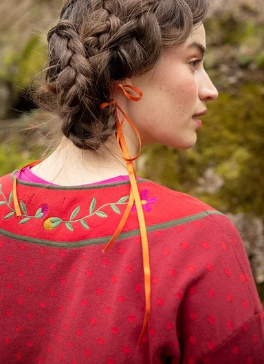 A creative friendship was the seed of this series: Gudrun’s inspiration came from her friend Wanja Djanaieff’s painting of a Greek groom’s shirt. The result is a folkloric series combining sumptuous embroidery with solid colors, woven stripes and checks. The jacquard-knit cardigan in a matching pattern fits in perfectly. You’ll find colorways ranging from indigo blue to bright folkloric hues, with hints of black and earth tones.