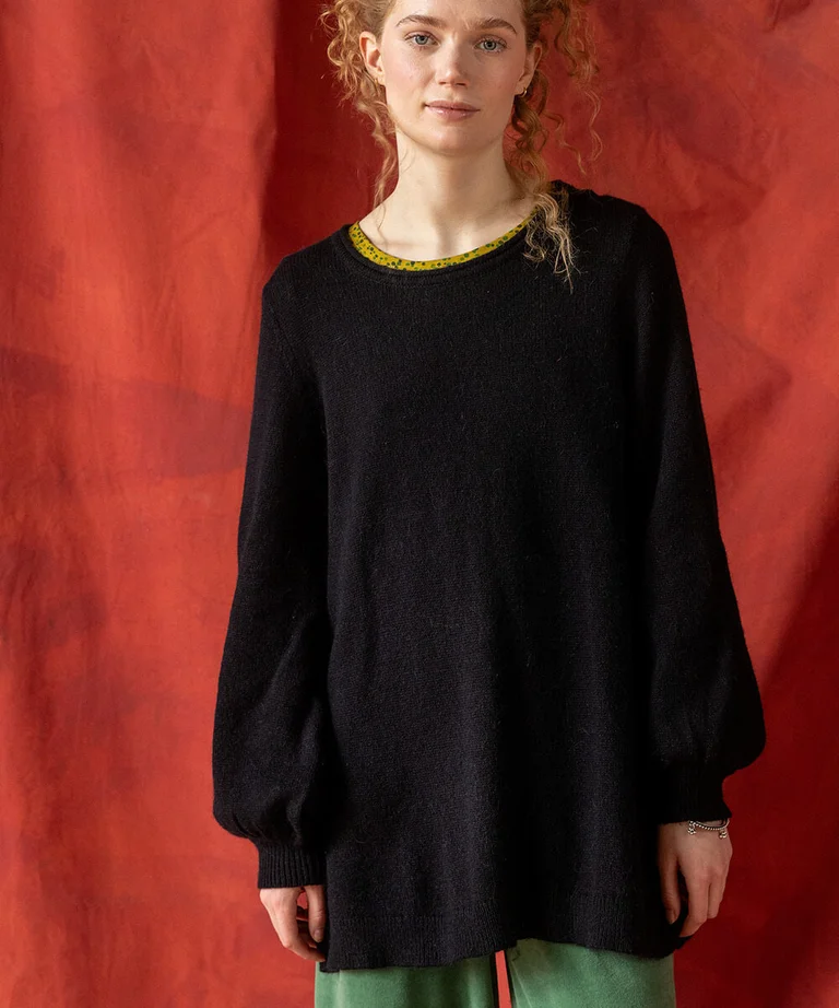 Ivy winds its way through anemones, dried twigs, dazzling fireworks and a sleepy fly with a little candy fish. This playful collection welcomes everyone to a beautifully set table. It’s inspired by the snowy peaks of the north to the warmest jungles of the south. You’ll find classics as well as new pieces. Printed jersey and velour, which also comes in solid colors, are paired with soft knit alpaca and a beautiful wool shawl.
