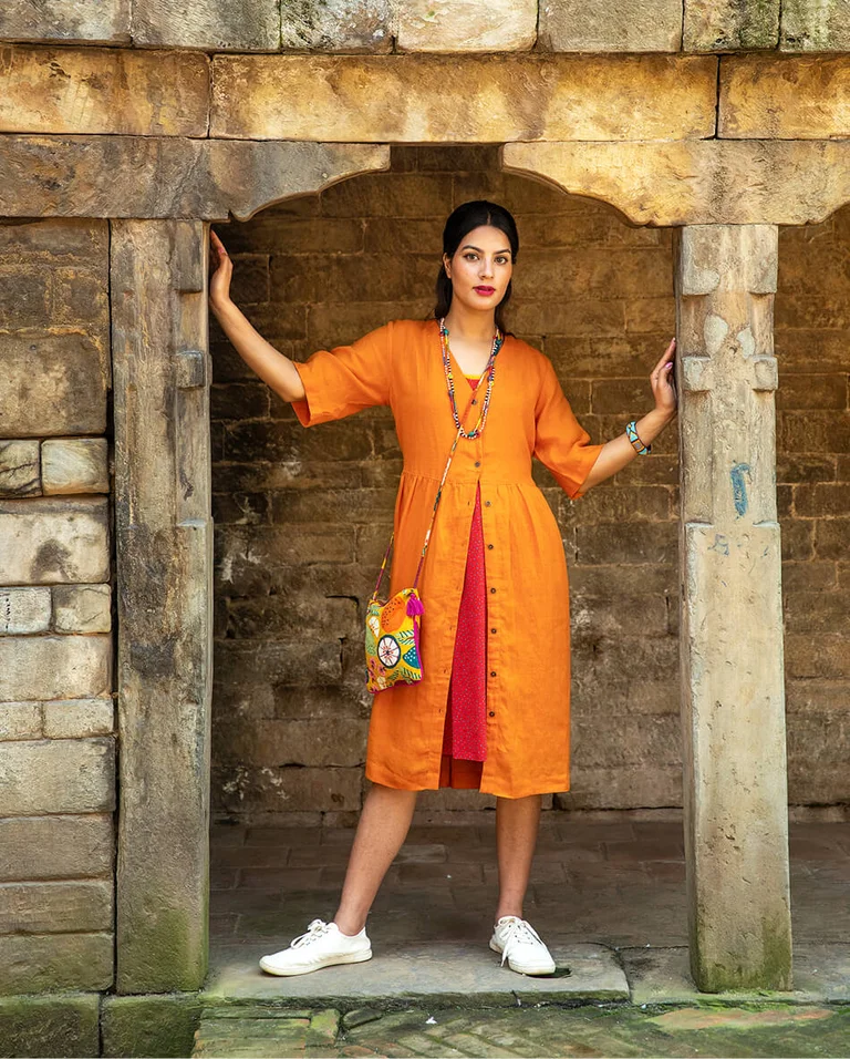 The button-through linen dress comes in an array of colours from pink to orange, from sapphire blue to cicada green and, last but not least, natural and black.
