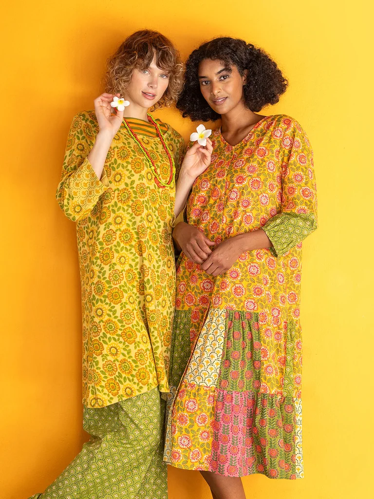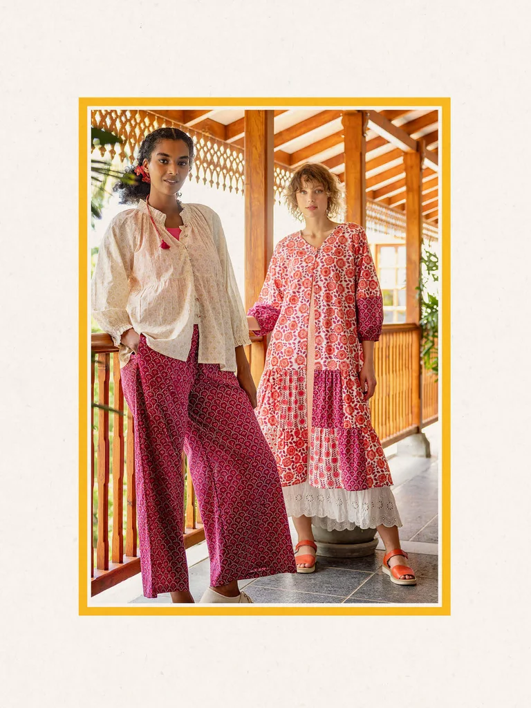 Lorsque nous entamons notre shooting, Gudrun trouve particulièrement pratique de commencer par l'hôtel. Et c'est exactement ce que nous faisons en arrivant dans la petite ville de Pondichéry. On y trouve des murs jaunes. Des murs de feuilles vertes. Et une grande terrasse devant nos chambres. Des environnements parfaits pour notre artisanat éclatant qui mêle impression au bloc et jersey agréable. Nous avons associé les différents motifs dans une merveilleuse robe d'été – en jaune, bleu et rouge clair.