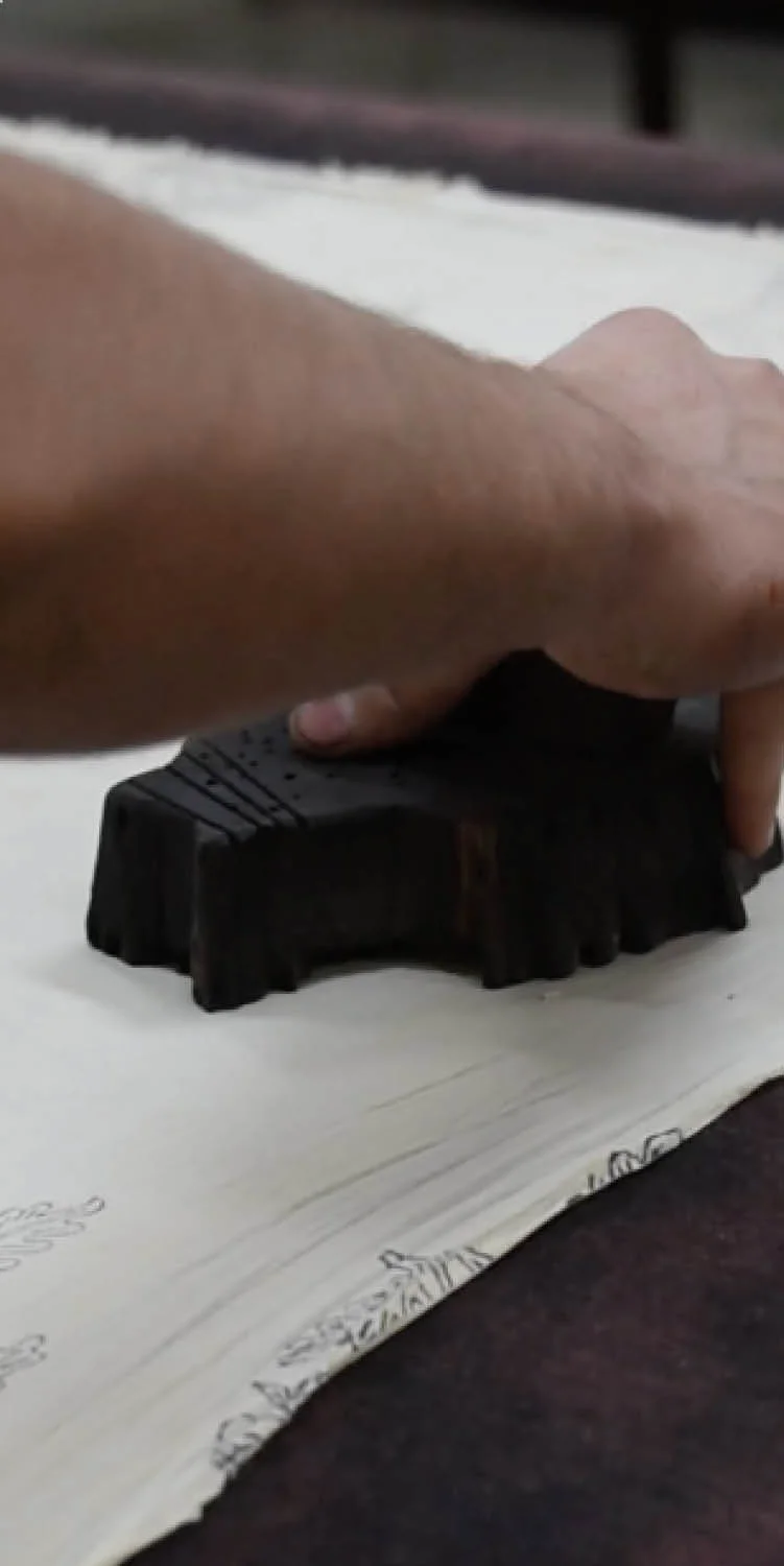 Long lengths of block-printed cloth drying outdoors on the ground in India.