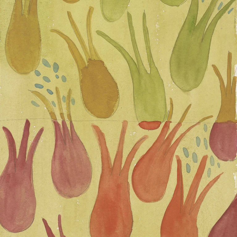 Tulpanen har sina rötter i södra Europa, norra Afrika och delar av Asien. Blomman fick sitt namn när turkiska sultaner började fästa en tulpan på sina turbaner, där ”tulpan” på persiska betyder just turban. Dess eleganta och tilltalande form har gjort den populär inom folkkonsten, precis som rosen. Gudrun har ofta låtit tulpanen prägla sin design, både i tryckt och stickat. Hon tycker att det är en blomma som sprider glädje och återkommer gärna till den med sin pensel. Varje tulpan förmedlar en känsla av liv och skönhet.