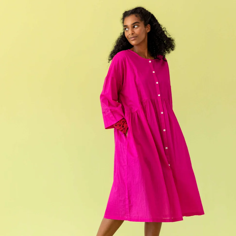 Men vad är det egentligen som gör våra rosa klänningar så unika? Jo, det sitter i detaljerna! Handgjorda veck skapar struktur och rörelse, medan diskreta pärlemorknappar tillför en exklusiv accent. Flera modeller pryds av mjuka rynkningar vid ärm och midja. När det kommer till material har vi också lagt stor vikt vid både komfort och kvalitet. Du kan hitta bomullsklänningar av finaste kvalitetsbomull, och linnekreationer som bara blir vackrare med tiden.